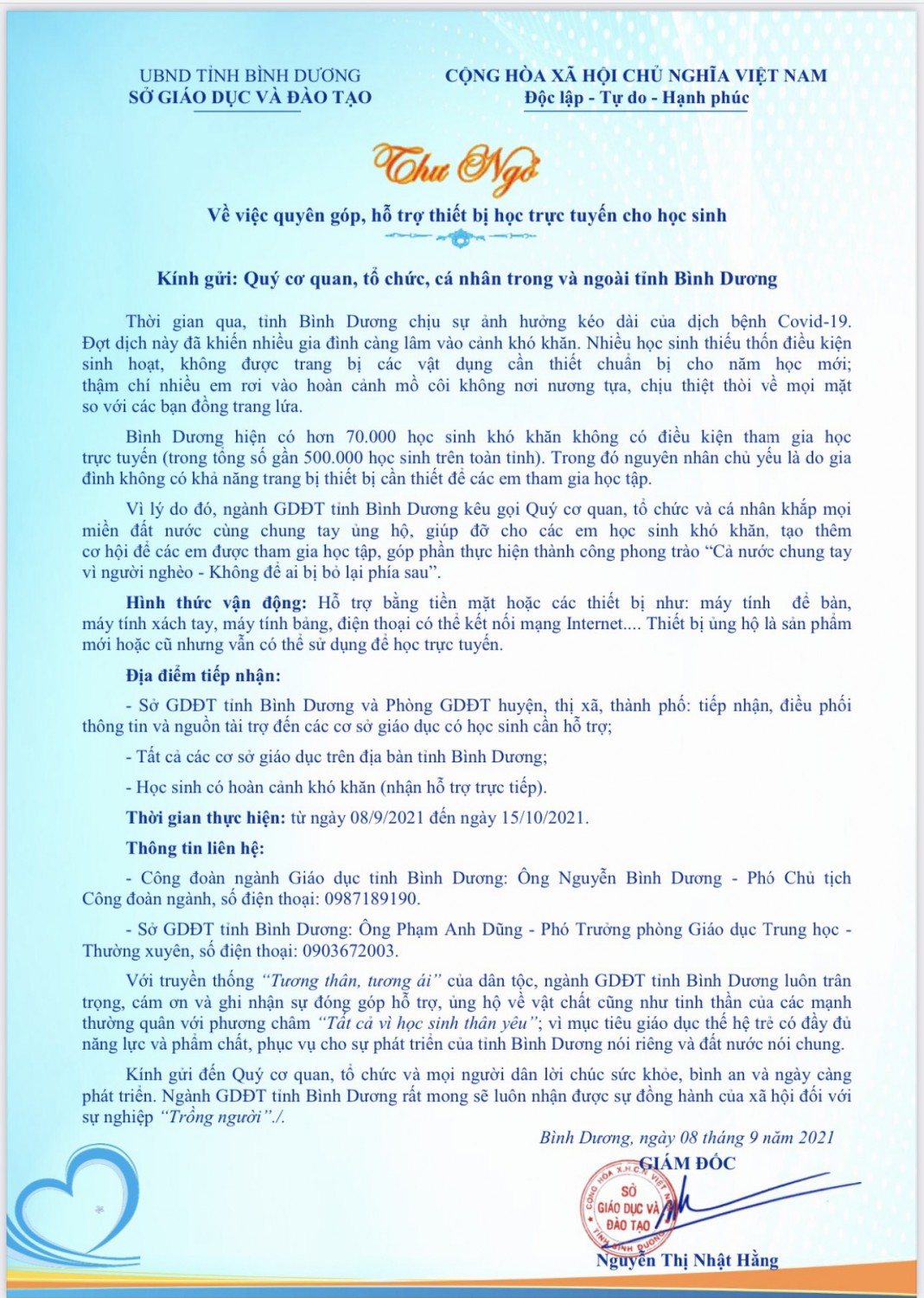 Thư về việc quyên góp, hỗ trợ thiết bị học trực tuyến cho học sinh